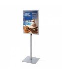 Atril porta menú con marco inclinado para impreso formato A4. Fabricado con poste en aluminio anodizado plata y base de madera lacada en color gris aluminio.